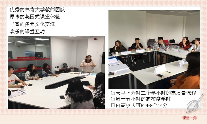 该项目是一个为期两周在英国林肯大学的“微”留学项目:旨在短时间内提高学生的英语能力,拓展国际视野,感受英式教育的不同理念和授课方式。在海外的课堂学习中,主要通过阅读,听力,写作,口语,分门别类的深入解析,提升英语水平,特别是在陈述、研讨技术、演讲和写作方面的技巧提升。所有教职员工是林肯大学富有丰富英语教学经验的一线优秀教师。在浸泡式的英语环境中,学生不仅体验真实海外名校课堂,更可以学习纯正的英伦文化。