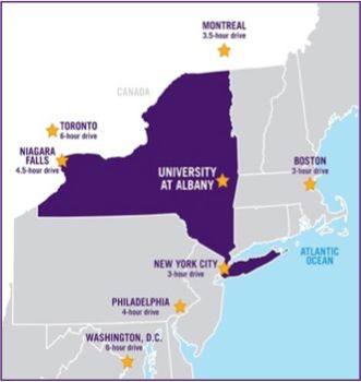 纽约州立大学共由64所分校组成,是世界上最庞大的高等教育系统,也是最大、最全面的州立大学系统。奥尔巴尼分校位于纽约州首府奥尔巴尼市,距离纽约和波士顿均两个半小时车程,交通十分方便。