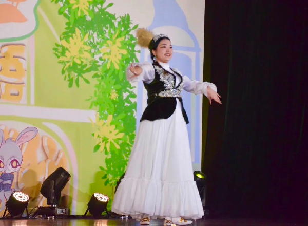 炽热过后,舞台氛围转向深沉宁静,财税与公共管理学院2025级财政学专业的莫勒迪尔·叶尔兰献上民族舞《黑走马》。她以沉稳有力的舞步、细腻传神的肩臂动作,生动模拟出骏马奔驰的律动与骑手的飒爽,将观众瞬间带往辽阔草原,深刻传达了哈萨克族豪迈、深情与自由的精神,赢得了满堂喝彩。