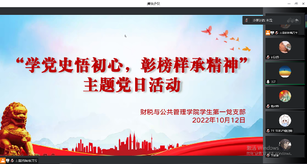 回望过去奋斗路,眺望前方奋进路。百余年的时间刻度蕴含着百余年的砥砺前行、初心不变,在党的二十大即将召开之际,为深入了解新时代经济工作发展的核心要义、精神实质、丰富内涵、实践要求,贯彻落实党史学习的必修课,从榜样事迹中提高自身觉悟,更加明确当代青年的时代使命,在新时代新征程上迸发更耀眼的青春光芒,2022年10月12日,财税与公共管理学院学生第一党支部于腾讯会议开展了“学党史悟初心,彰榜样承精神”线上主题党日活动,支部全体师生党员、发展对象、入党积极分子参加活动。