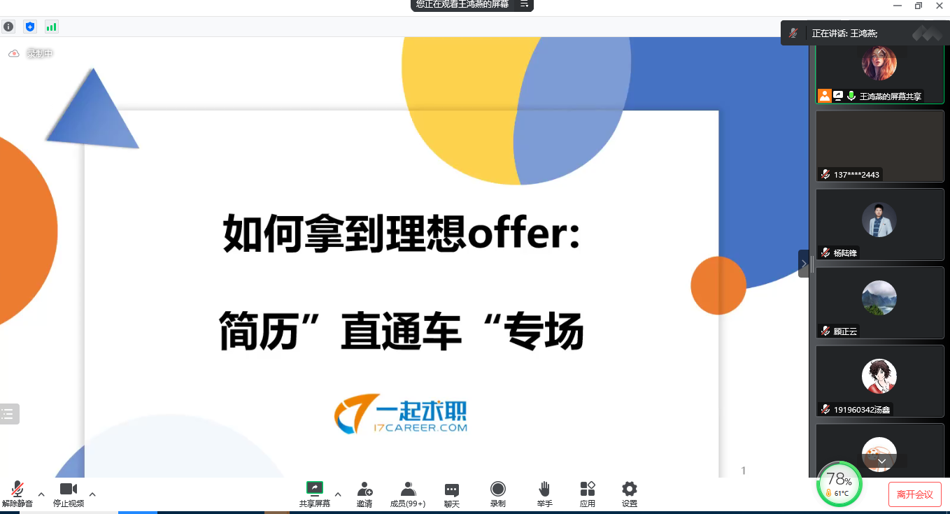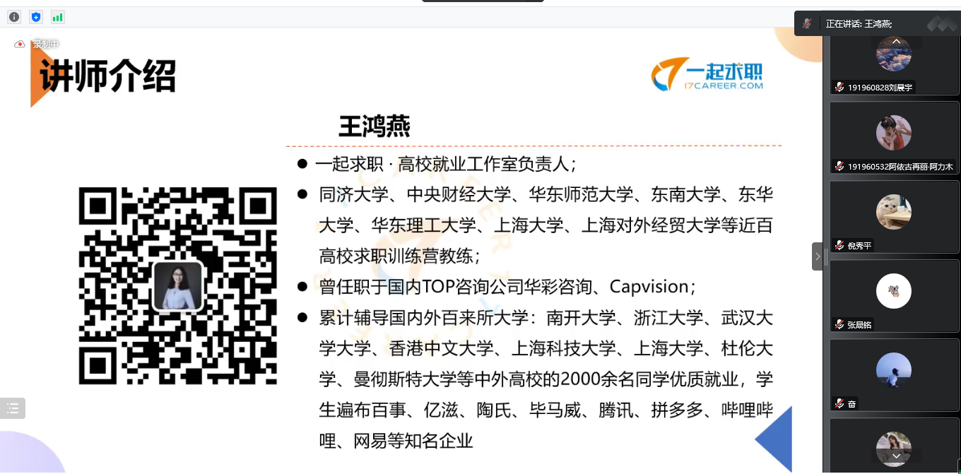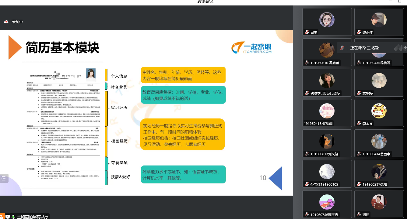 为提升学生求职技能,解决学生简历制作中的疑问,10月26日,财税与公共管理学院邀请“一起求职”全国高校工作室资深职业规划师王鸿燕老师作题为《简历“直通车”做好求职第一步》的线上讲座。学院党总支副书记、副院长顾正云,2023届毕业班师生参与了本次线上会议。