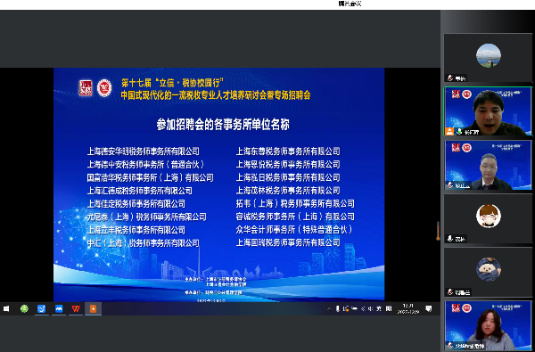 在举行研讨会的同时,校园专场招聘会也在线上如火如荼地进行。本次招聘会有尤尼泰(上海)税务师事务所、上海立信诚瑞税务师事务所等16家税务师事务所参加,230余名同学线上参会。各用人单位分别进行了招聘宣讲,介绍了企业发展情况、业务范围、发展战略、校招计划、应聘渠道等。学院已签约税务师事务所的税收学应届毕业生代表也在线分享了自己的实习经历、求职经验和应聘技巧。招聘会受到了用人单位和学生的一致欢迎,16家用人单位共收到近百份实习和求职简历。