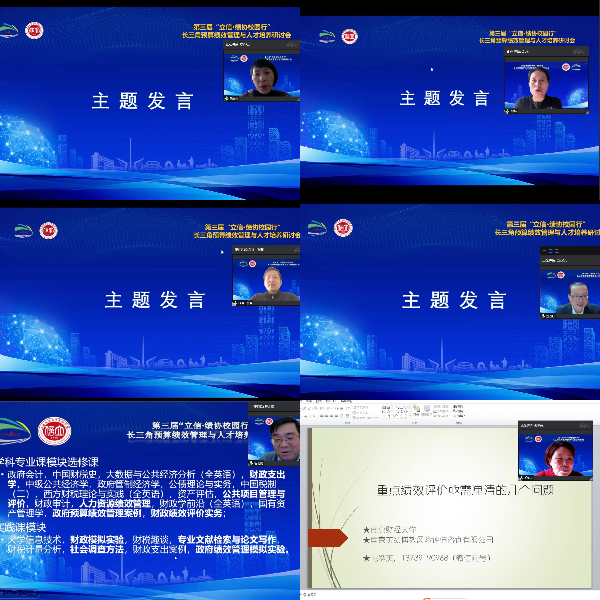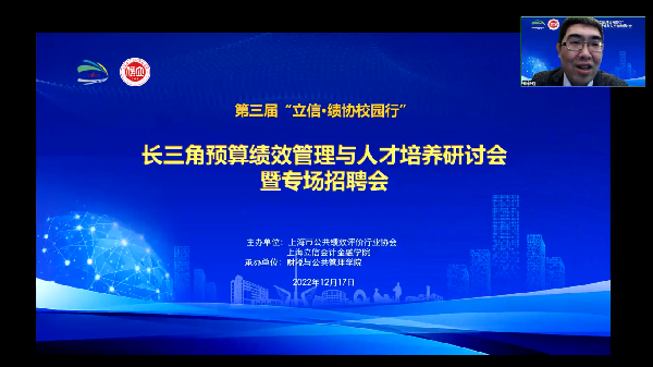 2022年12月17日,由上海市公共绩效评价行业协会、上海立信会计金融学院主办,财税与公共管理学院承办的第三届“立信•绩协校园行”长三角预算绩效管理与人才培养研讨会暨专场招聘会在线上成功举行。上海立信会计金融学院党委常委、副书记、副校长长王军华,上海市财政局绩效评价管理处处长苏永军,上海市公共绩效评价行业协会会长刘国永分别致辞。来自上海市区级财政局、预算绩效管理第三方中介机构和高校的嘉宾代表出席会议。财税与公共管理学院党政领导班子全体成员,以及财政系教师代表出席研讨会。开幕式环节由财税与公共管理学院院长张毅强主持。