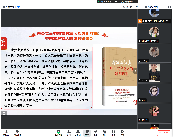 接着进行了红色经典书籍阅读分享活动。党员赵郡玮向大家分享了书籍《雷锋日记》,预备党员范家睿与张楠分别向大家分享《看万山红遍:中国共产党人的精神谱系》以及《雪域长歌》两本红色书籍。通过红色经典书籍的阅读与分享,党员们被雷锋同志的精神品质深深打动,被十八军全体官兵克服艰难险阻进军西藏表现的民族精神深深震撼。读懂红色经典书籍,读懂中国共产党的精神,我们深刻体会到中国共产党人的精神谱系是中国共产党带领中国人民在实践与奋斗中凝结而成的精神瑰宝和思想精华。