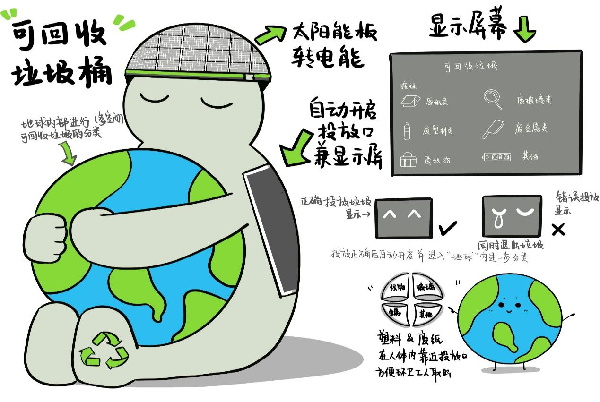 在垃圾分类知识竞赛活动的热烈氛围中,线下同步开展了面向广大同学的垃圾分类垃圾桶形象设计比赛。本次设计大赛旨在培养学生创新思维,激发学生的创造能力,让他们充分发挥自己的想象,设计出独一无二的垃圾桶。