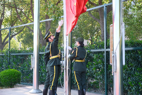 全体师生庄严肃立,校国旗护卫队成员端庄肃穆、步伐坚定地将国旗护送至升旗台。随着国歌奏响,神圣的五星红旗巍巍升起,师生们面向国旗齐唱国歌、行注目礼。