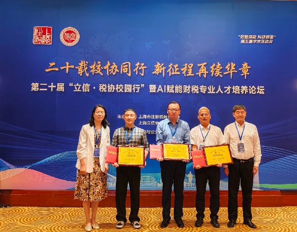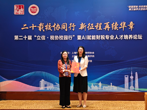 学院向上海市注册税务师协会赠送锦旗,致谢协会二十年来在产教融合方面的全方位支持。学院和协会共同为立信税务师事务所、尤尼泰(上海)税务师事务所、上海立信诚瑞税务师事务所3家单位授予“突出贡献奖”,表彰其为“立信・税协校园行”活动以及校企合作做出的突出贡献。学院向北京天扬财税服务集团、上海博爱方本律师事务赠送纪念品,致谢两家单位对本次会议的赞助支持。