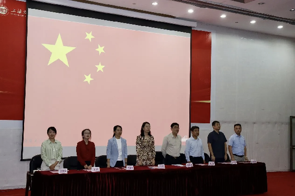 开学典礼在庄严的国歌声中拉开帷幕。全体师生向国旗行注目礼,齐唱国歌。