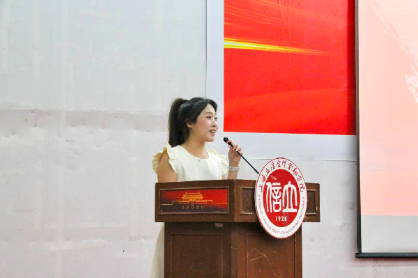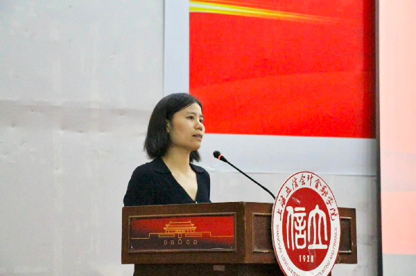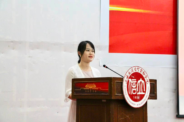 财政系教师朱玉梅作为教师代表寄语新生。她对新生提出三点期望:一是珍视人格独立性,摒弃“等靠要”想法、理性看待绩点;二是守护内在创造性,善用AI,提升批判性思维和创造力;三是践行行动自主性,主动实践,做行动中的“创变者”。