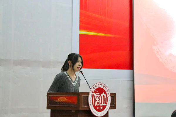 2022级税收学专业的迟依林作为在校生代表发言。她结合自身经历分享了三点成长感悟。一是学会勇敢接受挑战,在反复尝试中超越自我;二是秉持立信初心,肩负起属于自己的责任;三是探索兴趣、坚守诚信,学会成为更好的自己。