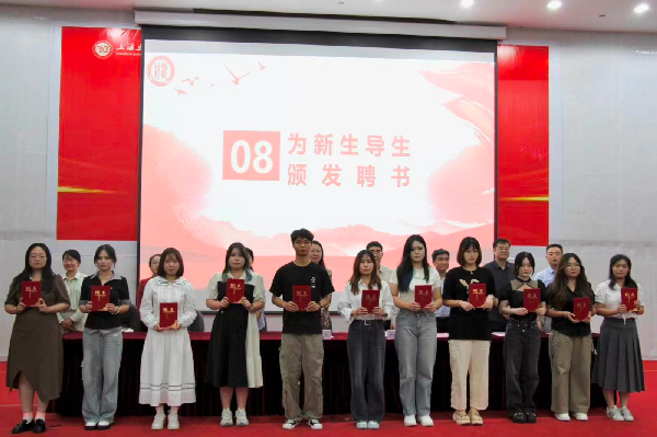 学院领导、系主任为2025级新生导生颁发聘书,感谢他们过去两个月的辛勤付出,用实际行动践行“传帮带”精神,成为新生初入校园时温暖的“成长引路人”。