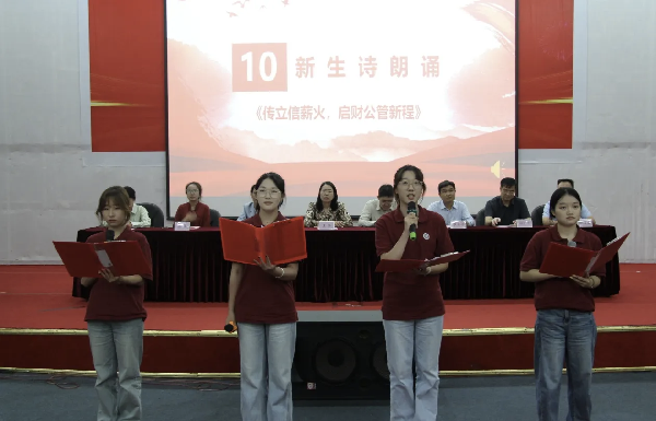 2025级新生代表田依楠、闫敏舟、周笑笑、杨紫带来原创诗朗诵《承立信薪火,启财管新程》。承载着新生对大学的憧憬、对专业的热忱,传承“立信”精神,启航未来,不负热爱!