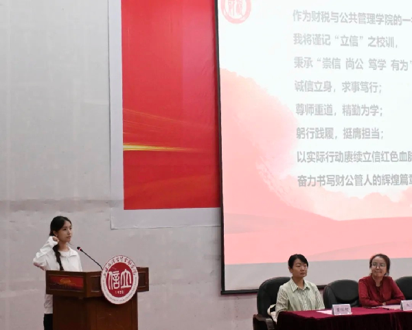 2025级行政管理专业的丁苡萌作为新生代表发言。她号召新生以“立信”精神为指引,脚踏实地学好专业知识,积极参与社会实践,将“小我”融入“大我”,用实际行动诠释“崇信、尚公、笃学、有为”的内涵。