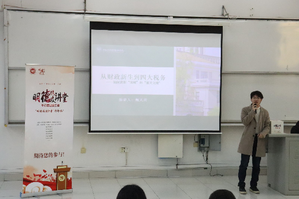 现任江苏艾兰得营养品有限公司税务专员(海外税方向)的鲍天玥以“从财政新生到四大税务——如何获取‘围城’的‘通关文牒’”为主题,分享了他从校园到职场的蜕变历程。详细讲述了自己在毕马威会计师事务所到现在工作岗位的丰富经历,为同学们揭秘如何在校期间积累核心竞争力,获取心仪offer的“通关秘籍”。