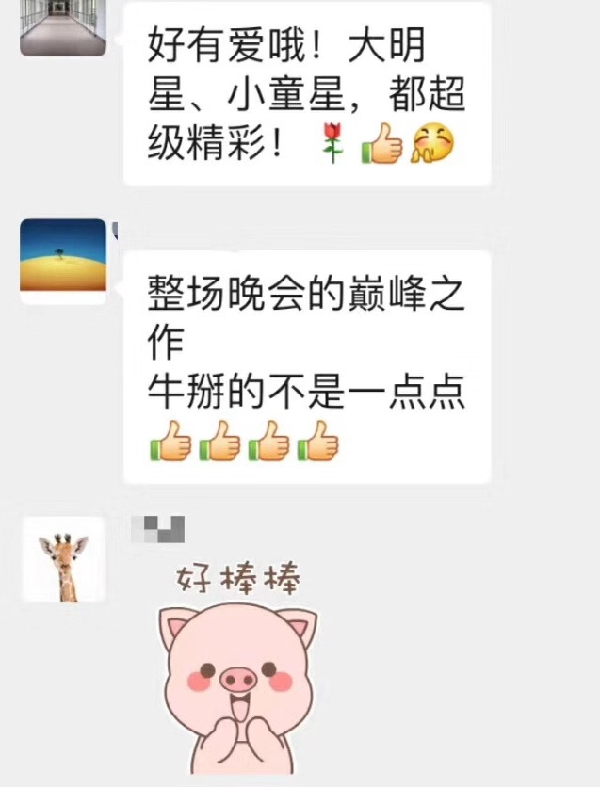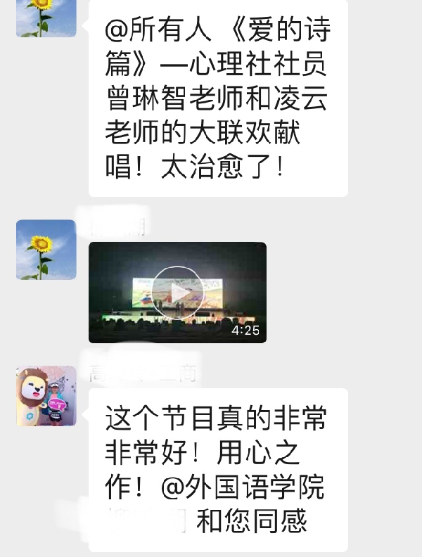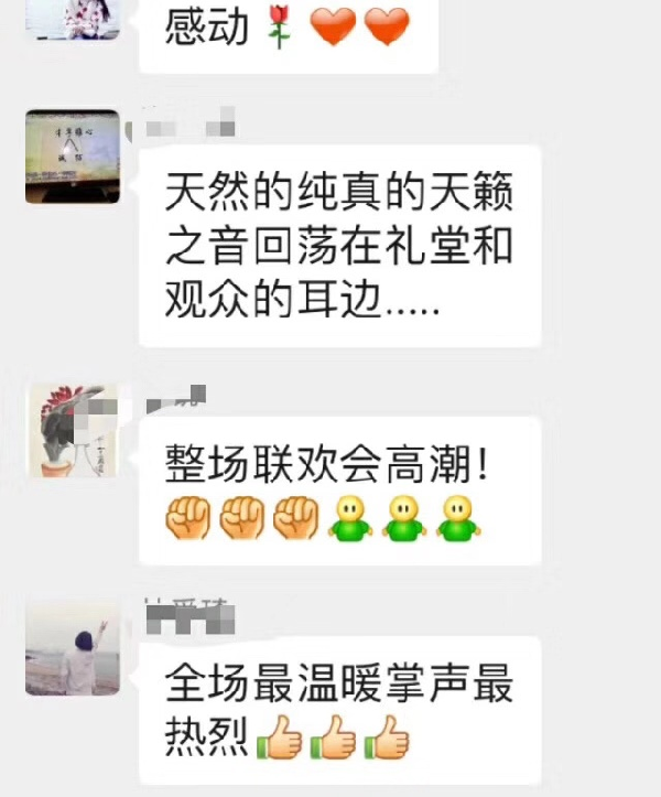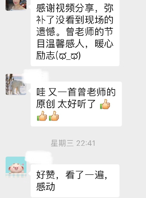 看到这个演出,觉得特别温馨,就像我自己的经历。在学校工作八年了。从我刚来学校工作,一个初出校园的毕业生,到现在结婚有了孩子,在这个城市扎根。看着你们唱歌和背景滚动的图片,突然眼泪就出来了止不住。