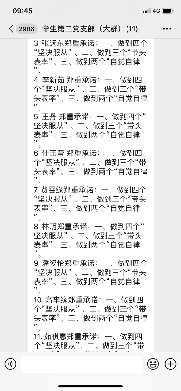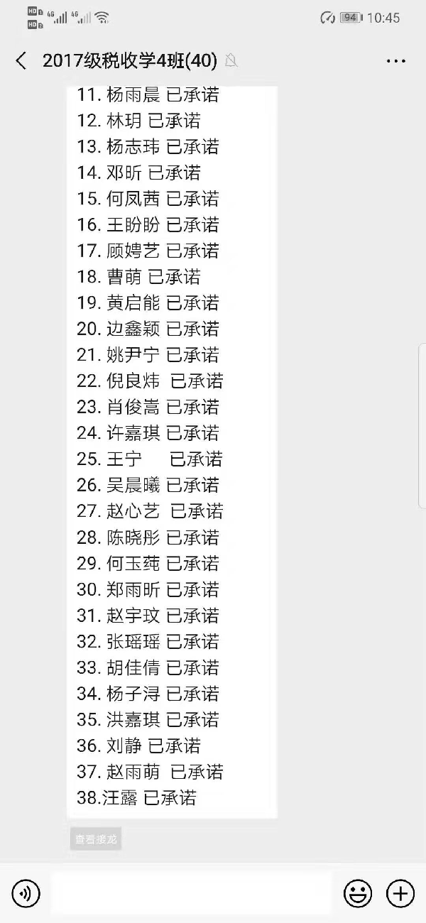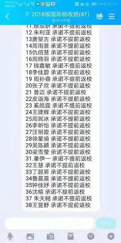 财税与公共管理学院的学生们高度关注疫情的进展,积极做好抗击疫情的防护工作,表示虽然不能奋战在“战疫”最前线,但始终会与祖国同呼吸、与人民共患难,用自己的行动为抗击疫情做出积极的贡献。同学们纷纷郑重承诺:增强大局观念,做到不提前返校;坚持“每日一报”,主动配合疫情防控;做好自我防护,关注个人身心健康;合理安排假期,不断充实自我;传播网络正能量,做到不传谣、不信谣,并分别在各年级、各专业班级群中进行接龙、完成承诺活动,达到了全覆盖。作为学生中的骨干力量,学院全体学生党员也郑重作出做到四个“坚决服从” 、做到三个“带头表率”、做到两个“自觉自律”的庄严承诺,并表示将随时听从党组织的号召,自觉践行初心使命,为疫情防控阻击战竭尽一名共产党员的担当与忠诚。