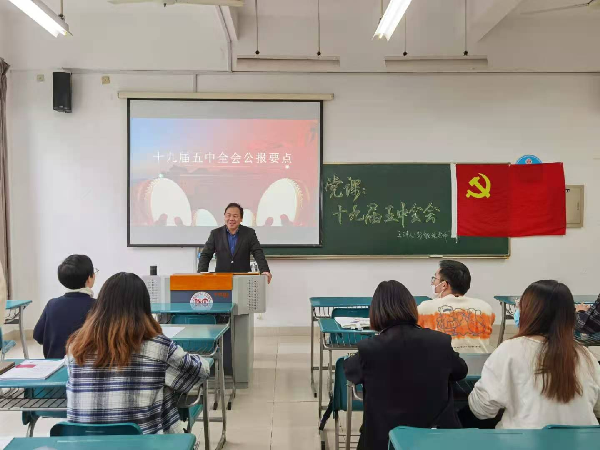 首先由学院副院长彭锻炼老师讲党课。彭老师带领大家学习了党的十九届五中全会公报要点。党的十九届五中全会充分肯定了党的十九届四中全会以来中央政治局的工作,高度评价了决胜全面建成小康社会取得的决定性成就,深入分析了我国发展面临的深刻复杂变化,强调了到二〇三五年要基本实现社会主义现代化远景目标,剖析了“十四五”时期经济社会发展的主要目标以及发展中的指导思想和必须遵循的原则。党课使大家明白了党的十九届五中全会是在全面建成小康社会胜利在望、全面建设社会主义现代化国家新征程即将开启的重要历史时刻召开的一次十分重要的会议,对推动全面建设社会主义现代化国家开好局、起好步,具有重大而深远的意义。彭锻炼老师在党课最后带领大家学习了党风廉政方面的内容,特别指出要深化标本兼治,提升反腐败治理效能,也希望大家能够警钟长鸣,不断同腐败现象作斗争。